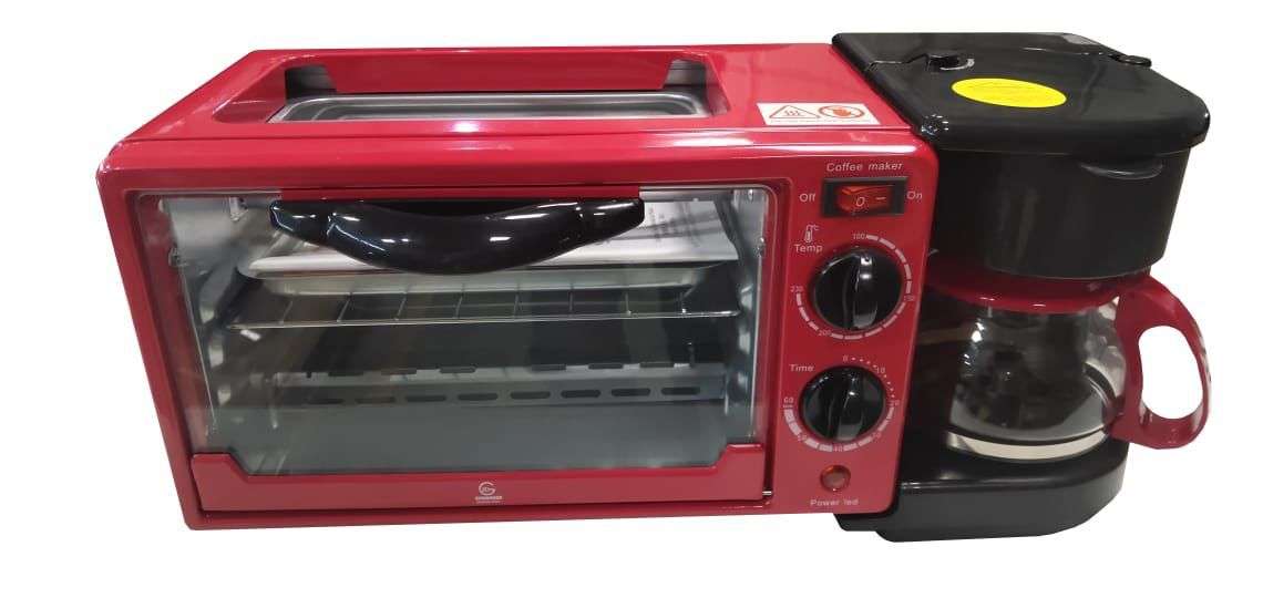 Multi functional Electric 3 in 1 Breakfast Oven and Coffee Maker. This appliance can toast bread, cook fried eggs, sausages, meat, bakes pies, pizza and cook coffee or tea simultaneously. This multi function over is perfect to boil and reheat foods quickly .