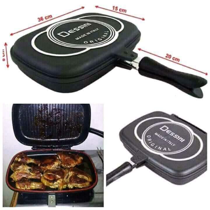 This latest new design double sided grill pan is a must have cookware for your kitchen, the double sided pan with the silicon sealing on the edge and magnetic locking mechanism will create a pressure effect while cooking, locking in the heat and pressure to cook the food more quickly and evenly, therefore saving time and energy. The sealing will also prevent odor and smoke escaping from the pan while frying, it will also prevent oil splattering, making frying your favorite food cleaner and easier, the excess oil and water will flow out through the drip tray for easy cleaning. The ergonomic handle design and stainless steel handle holder will ensure safe and comfort handling while cooking.