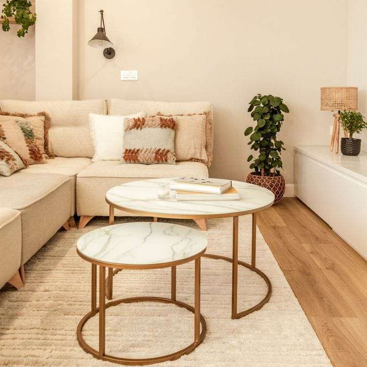 This nesting coffee table brings a sophisticated modern look to any environment, bringing elegance to your home. Modern design creates a cozy atmosphere and provides enough space to place drinks and decorations on top. The modern design of the thick steel frame is sprayed on the surface to prevent it from falling off of the paint, firm and durable, not easy to bend and shake. Marble texture design on the tabletop has two options: MDF and glass tabletop, smooth and delicate, no burrs in the hands, anti-collision, easy to clean, can be used in any environment. The table has a marble effect to make your living room look warm and cozy.